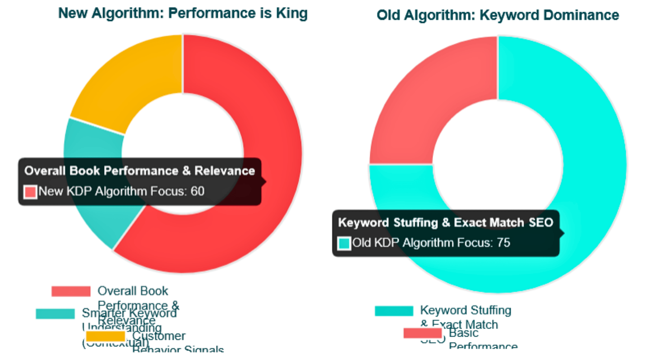 Two Donut charts showing old and new KDP algorithm focus